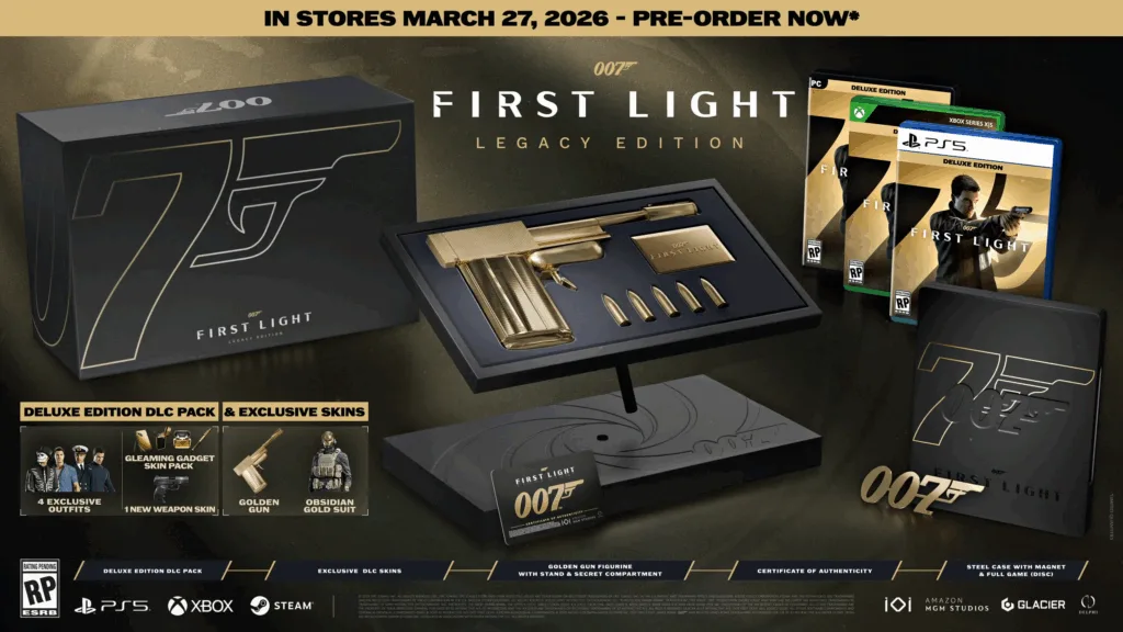 IO Interactive przygotowało również gratkę dla kolekcjonerów. Specjalne wydanie 007: First Light zawiera steelbook oraz replikę złotego pistoletu, jednego z najsłynniejszych rekwizytów w historii filmów o Bondzie. Cena zestawu wynosi 300 dolarów (około 1100 zł) i już teraz można go zamawiać na Amazonie (PC, PS5, XBOX).