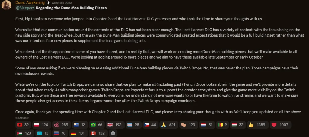 Skala krytyki zmusiła deweloperów do działania. Na oficjalnym Discordzie przyznali, że komunikacja była niejasna, a gracze mogli poczuć się wprowadzeni w błąd. Dodatek bowiem miał skupiać się tylko na pobocznej historii i nowym pojeździe. Twórcy w ramach rekompensaty obiecali dorzucić piętnaście nowych elementów konstrukcyjnych, które trafią do wszystkich posiadaczy Lost Harvest pod koniec września lub na początku października.