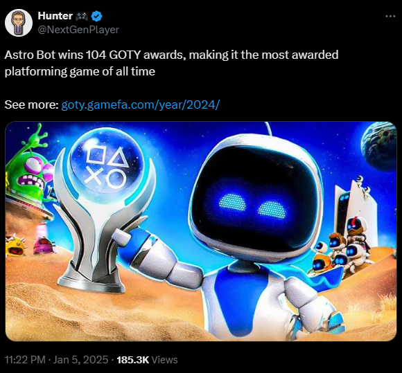 Gra platformowa Astro Bot, stworzona przez zespół Team Asobi, zdobyła ogromne uznanie na całym świecie. Po wygranej w kategorii Gry Roku na The Game Awards 2024, tytuł ten pobił rekordy. Zdobył 104 nagrody Game of the Year, co czyni go najbardziej nagradzaną grą platformową w historii.