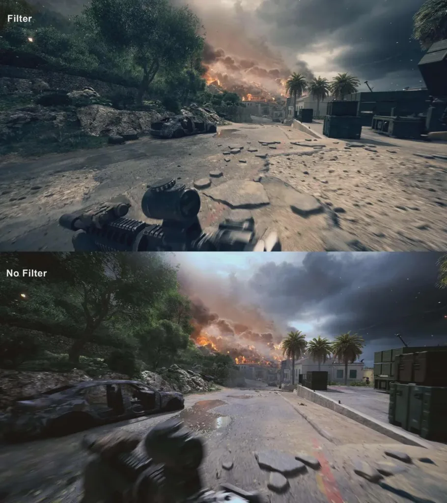 Wielu fanów zauważyło, że lokacje w Battlefield 6 są utrzymane w zimnym klimacie. Przyciemnione drzewa, stalowe chmury oraz błyszcząca broń sprawiają wrażenie, że całość została przykryta dodatkowym filtrem graficznym. Z tego powodu część graczy zaczęła publikować własne wersje lokacji z bardziej nasyconymi barwami.