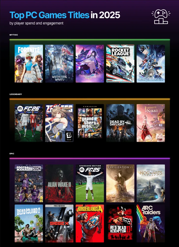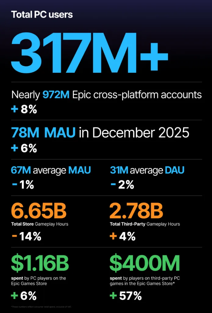 Jednak nie wszystko wygląda tak różowo. Łączna liczba godzin spędzonych w grach na platformie spadła do 6,65 miliarda, czyli o około 14% mniej niż rok wcześniej. Innymi słowy, Epic Games Store przyciąga nowych użytkowników, ale ci spędzają w nim mniej czasu niż wcześniej. Dla wydawców i deweloperów to sygnał, że sama skala nie zawsze idzie w parze z zaangażowaniem.