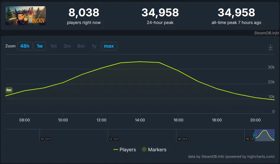 Choć Escape From Duckov powstawało jako niezależny projekt, jego premiera przeszła oczekiwania wszystkich. Gra zadebiutowała 16 października 2025 roku i w ciągu kilku godzin przyciągnęła prawie 35 tysięcy graczy jednocześnie. To liczba, której nie powstydziłby się niejeden duży tytuł AAA.
