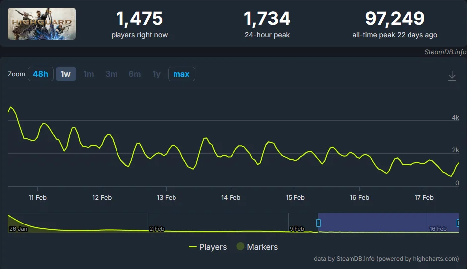 Początkowo wszystko wyglądało obiecująco. Na platformie Steam Highguard przyciągnął około 97 tysięcy graczy jednocześnie. To wynik, którego nie powstydziłaby się niejedna marka z ugruntowaną pozycją. Najpierw był więc entuzjazm, później ciekawość, a następnie, szybkie zderzenie z rzeczywistością.