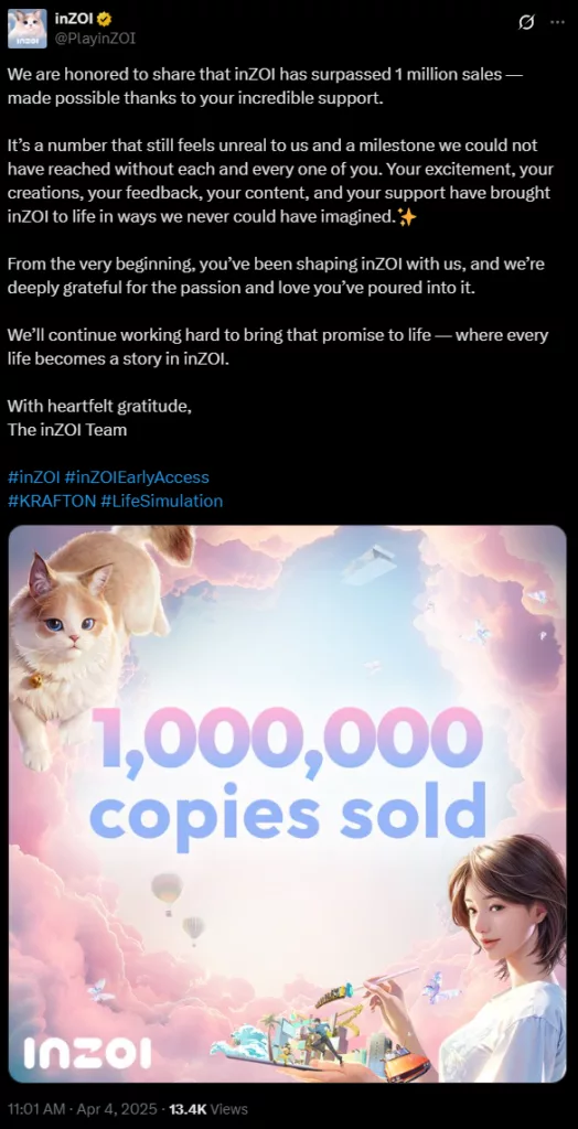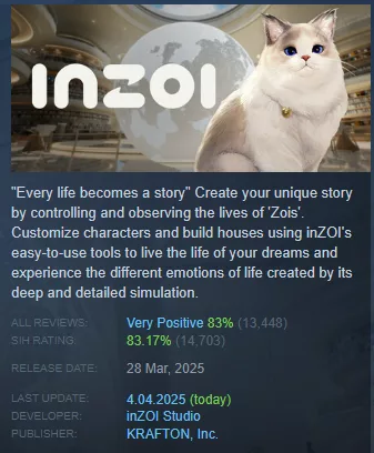 Premiera inZOI miała miejsce 28 marca 2025 roku i niemal natychmiast po udostępnieniu gra wskoczyła na listę bestsellerów platformy Steam. Wciąż utrzymuje się w pierwszej piątce najchętniej kupowanych tytułów, co więcej, w szczytowym momencie jednocześnie grało w nią ponad 87 tysięcy użytkowników.
