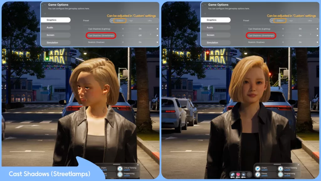 Jedną z najważniejszych nowości jest system cieni, który nadaje światu gry zupełnie nowy charakter. Latarnie miejskie po zmroku rzucają teraz realistyczne cienie, a wnętrza mieszkań zyskały bardziej filmowy klimat. Twórcy umożliwili również aktywację szczegółowych cieni w ustawieniach graficznych – opcja ta wpływa na jakość detali, choć wymaga mocniejszego sprzętu.
