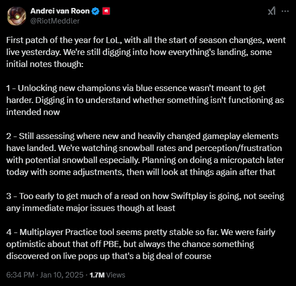 Andrei van Roon, szef League Studio, odniósł się do tych obaw na Twitterze, stwierdzając, że „odblokowywanie nowych bohaterów za pomocą Niebieskiej Esencji nie miało stać się trudniejsze” oraz że zespół analizuje tę kwestię. Nie podano jednak konkretnych informacji na temat planowanych zmian w systemie.