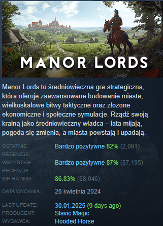 Nie tylko sprzedaż świadczy o sukcesie gry – Manor Lords cieszy się także bardzo pozytywnymi opiniami. Na platformie Steam użytkownicy dotychczas wystawili już ponad 57 tysięcy recenzji, a co więcej, aż 87% to oceny pozytywne. Gracze cenią produkcję przede wszystkim za głęboką mechanikę zarządzania, a także realistyczne odwzorowanie średniowiecza oraz satysfakcjonujący rozwój osady.