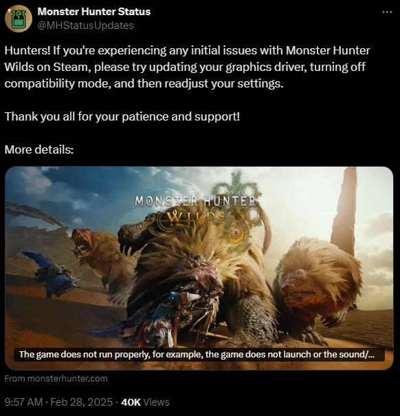 Pomimo ogromnej popularności, Monster Hunter: Wilds spotkało się z mieszanymi recenzjami na Steamie. Obecnie tylko 47% opinii jest pozytywnych, co klasyfikuje odbiór gry jako „mieszany”. Najczęstsze zarzuty graczy dotyczą problemów technicznych oraz niedostatecznej optymalizacji, szczególnie na słabszych konfiguracjach PC.