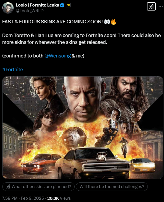 Epic Games nie zwalnia tempa, a kolejne przecieki ujawniają ekscytujące nowości. Według informacji dostarczonych przez znanego leakera Loolo, Fortnite planuje ponowną współpracę z serią filmową Fast & Furious. Tym razem do gry trafią nie tylko kultowe samochody, ale również skiny uwielbianych postaci