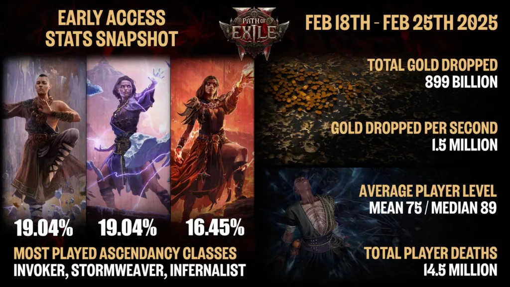 Grinding Gear Games, deweloperzy Path of Exile 2, opublikowali interesujące statystyki dotyczące rozgrywki. Wśród udostępnionych danych znalazły się informacje na temat najczęściej wybieranych klas jak i również liczby zgonów graczy oraz ilości zdobywanego złota. Jednakże dane obejmują okres tylko od 18 do 25 lutego, a ich analiza była możliwa dzięki nowo zatrudnionej analityczce danych – Lilylicious, która wcześniej była znana z aktywności w społeczności gry.