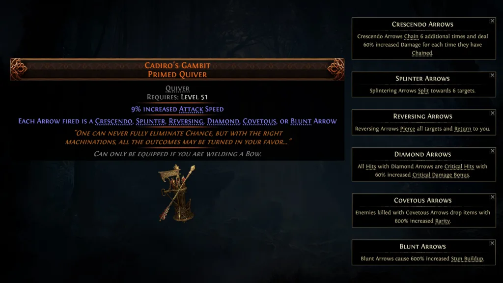 - Cadiro’s Gambit – losowy kołczan, który może wystrzeliwać różne typy strzał, zależnie od szczęścia gracza.