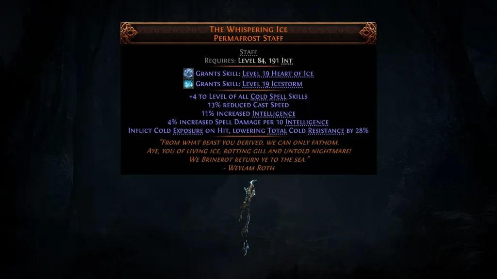 - The Whispering Ice – powracający kostur zwiększający obrażenia od inteligencji, obniżający odporność na mróz i aktywujący zaklęcie Icestorm.