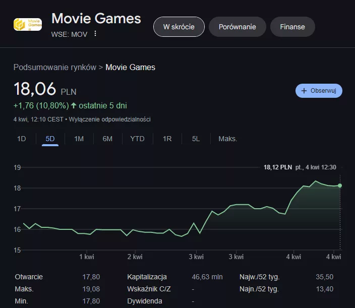 Informacje o dochodzeniu natychmiast odbiły się echem na warszawskiej giełdzie. Akcje Movie Games odnotowały 10-procentowy wzrost w ciągu zaledwie pięciu dni, osiągając poziom około 18 zł za sztukę.