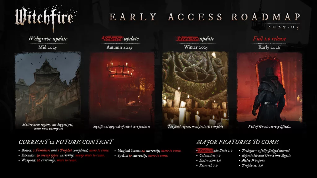Witchfire, klimatyczna strzelanka RPG od polskiego studia The Astronauts, wciąż znajduje się w fazie wczesnego dostępu. Deweloperzy podzielili się z graczami planem na kolejne miesiące, zapowiadając szereg nowości i zmian. Pełna wersja gry (1.0) planowana jest na początek 2026 roku, ale zanim to nastąpi, na fanów czeka kilka dużych aktualizacji.