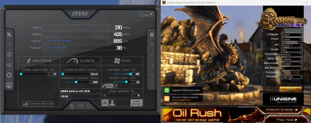 Uruchom Heaven Benchmark z ustawieniami Ultra i teselacją Extreme. Obserwuj maksymalne taktowanie i napięcie karty w MSI Afterburner lub GPU-Z. Te dane posłużą jako punkt odniesienia.