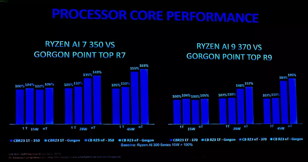 Według zaprezentowanych informacji, procesory z serii Gorgon Point będą opierać się na rdzeniach Zen 5, grafice RDNA 3.5 oraz akceleratorze AI XDNA 2. Choć brzmi to imponująco, źródła sugerują, że mamy do czynienia jedynie z odświeżeniem obecnych rozwiązań znanych z serii Strix Point. Potwierdzają to również wewnętrzne testy AMD, które pokazują jedynie kilkuprocentowy wzrost wydajności.