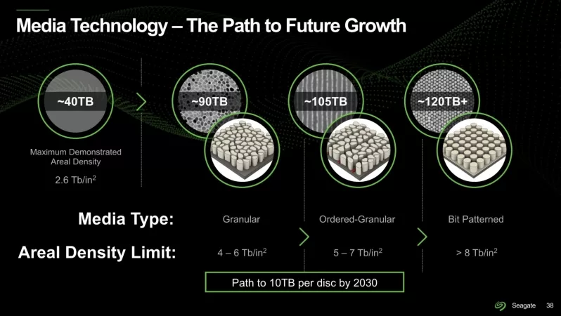 W przyszłości Seagate zamierza zastosować także w pełni wzorcowane nośniki bitowe (BPM), które umożliwią zapis o gęstości nawet 8 Tb/cal². To teoretycznie pozwoli stworzyć dyski o pojemności nawet 120 TB.