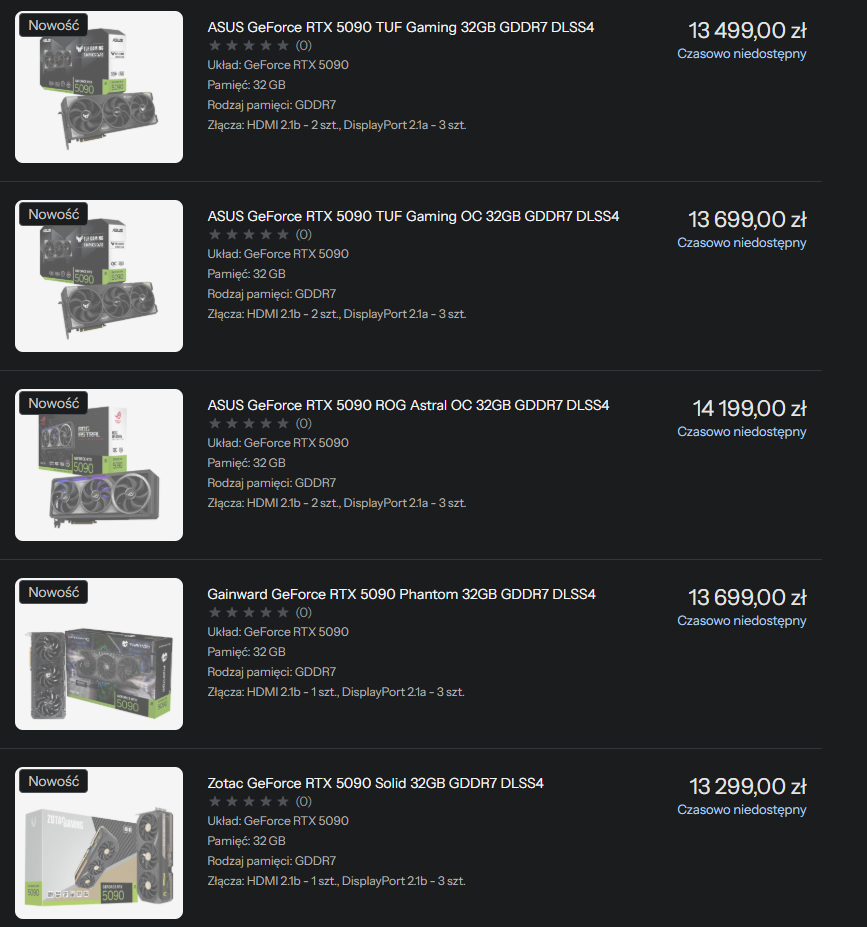 Ceny RTX 5090 miały zaczynać się od około 10 tys. zł, ale edycje premium kosztują już 13-14 tys. zł. Pomimo wysokiej ceny, karta cieszy się ogromnym zainteresowaniem, co doprowadziło do problemów z dostępnością i przeciążenia stron internetowych wielu sprzedawców.