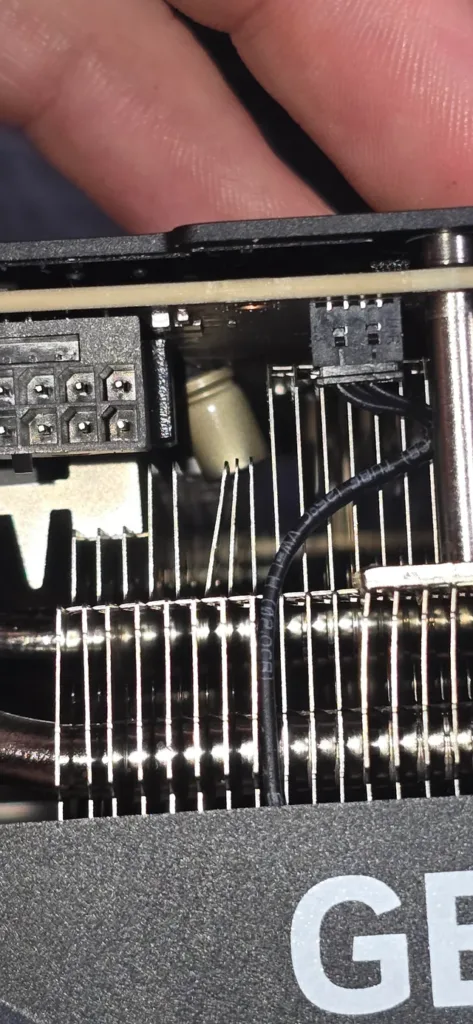 Sprzęt, który uległ awarii, to PNY GeForce RTX 5090 ARGB OC, kosztujący około 14 tysięcy złotych. Po dokładnych oględzinach okazało się, że eksplodował kondensator przy 16-pinowym złączu zasilania. Siła wybuchu była tak duża, że odkształciła żeberka radiatora.