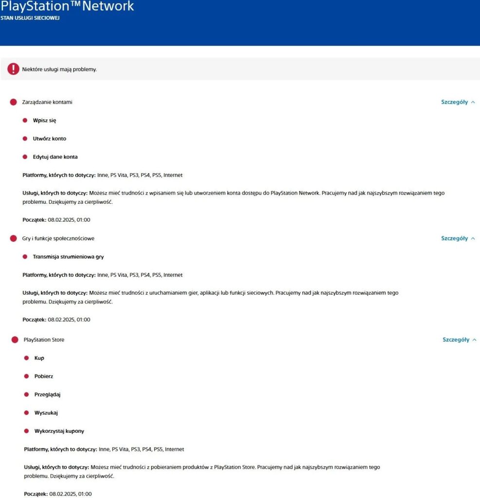 Pierwsze sygnały o awarii zaczęły pojawiać się około północy czasu polskiego, a skala problemu szybko się rozszerzyła. Oficjalna strona statusu usług PlayStation wskazuje, że usterka została zgłoszona około godziny 1:00. W praktyce oznacza to, że wielu graczy nie mogło zalogować się do swoich kont, uruchomić gier czy dokonywać zakupów w PlayStation Store.