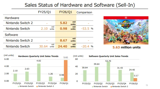 Imponującym wynikiem może pochwalić się także tytuł startowy, Mario Kart World. Gra sprzedała się w liczbie 5,63 miliona egzemplarzy, niemal dorównując wynikom samej konsoli. Co więcej, to druga największa premiera w historii serii Mario Kart, zaraz po edycji na Wii, która osiągnęła 6,42 mln sprzedanych kopii.