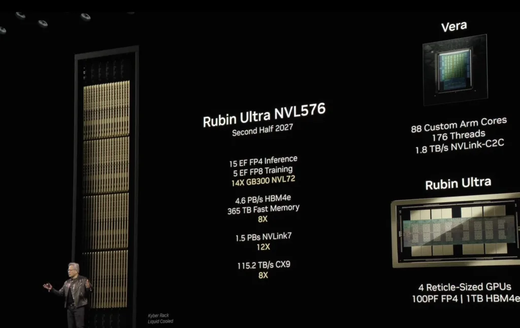 Nowa wersja skorzysta z pamięci HBM4e i zaoferuje do 365 TB pamięci w systemach rack. Przepustowość sięgnie w tym przypadku 4,6 PB/s, co czyni Rubina Ultra rozwiązaniem o klasę wyższym niż jakiekolwiek obecne systemy.