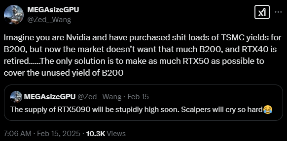 Według doniesień użytkownika MEGAsizeGPU, powołującego się na źródła związane z producentami kart graficznych, NVIDIA zmienia swoje plany produkcyjne. Firma zamierza zwiększyć zamówienia na konsumenckie układy graficzne Blackwell GB202, rezygnując częściowo z produkcji profesjonalnych chipów Blackwell GB200, na które popyt okazał się niższy od oczekiwanego.