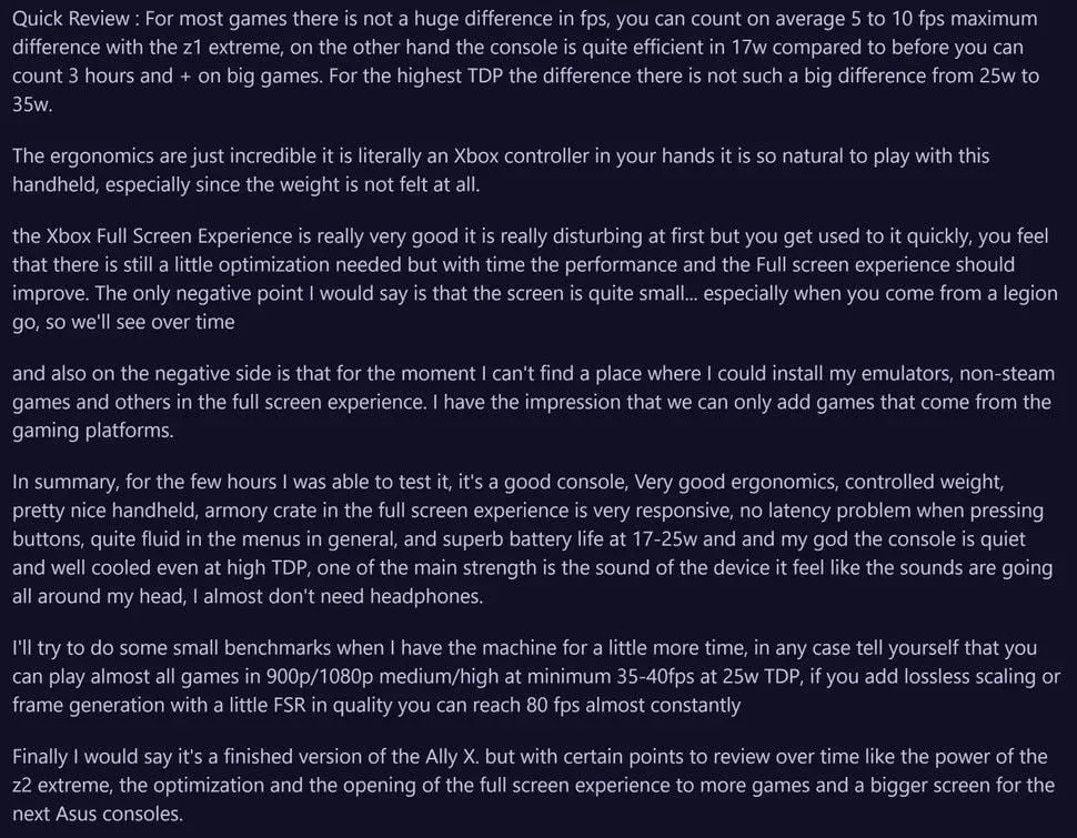 Co więcej, gracz zdążył przygotować krótką recenzję. Opisał, że XBOX Ally X jest wydajny, wygodnie leży w dłoniach i (co ważne) jego waga nie męczy podczas dłuższych sesji. Niestety, według autora, niektóre gry wciąż wymagają dodatkowej optymalizacji, a problemem pozostaje brak miejsca na instalację emulatorów.