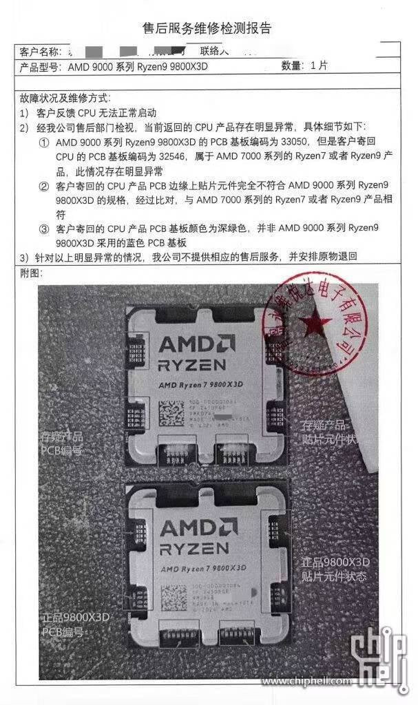 Kolejną wskazówką były różnice w oznaczeniu kodu na płytce. Oryginalny model procesora Ryzen 7 9800X3D jest oznaczony kodem „33050”, podczas gdy podróbka posiada kod „32546”, co jednoznacznie wskazuje na jej fałszywy charakter.